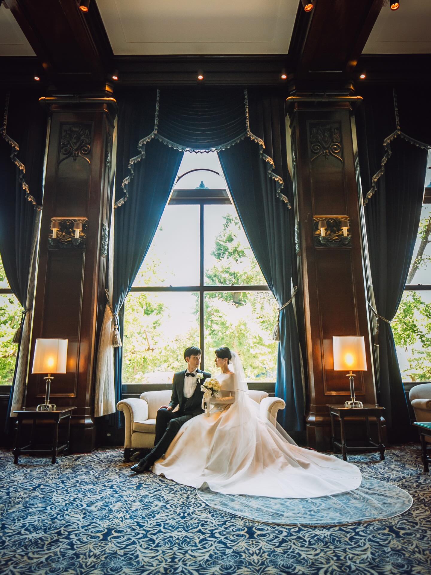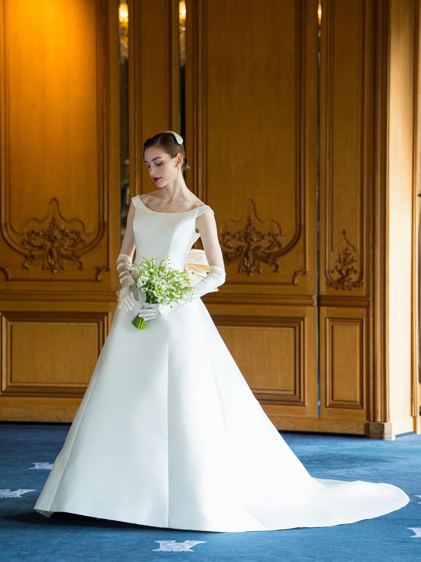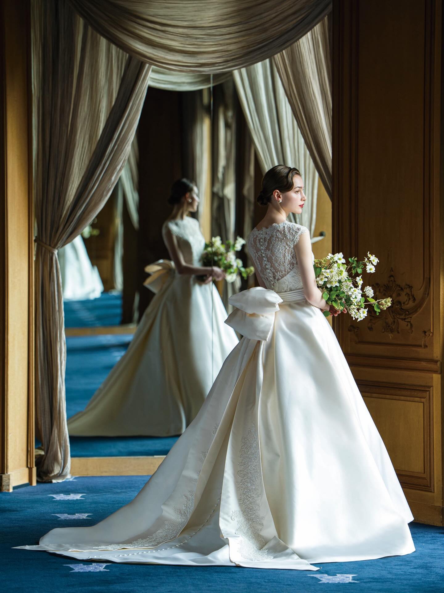 上質なミカドシルクのドレスと美しいレースを贅沢に用いたロングヴェールがクラシカルで格式の高い印象に__